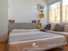 Ein kleiner Eingangsbereich führt in einen großzügigen, offenen Raum, der Wohn- und Schlafbereich harmonisch vereint. Die komplett ausgestattete Küchenzeile, der Essbereich sowie der Platz für zwei Schlafsofas und ein ausziehbares Bett ermöglichen eine angenehme Nutzung des Raumes auch tagsüber.