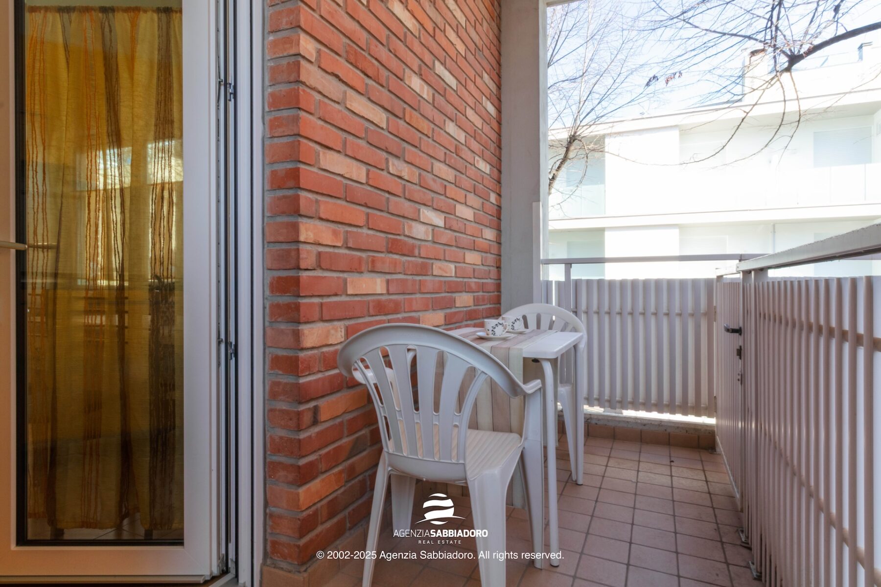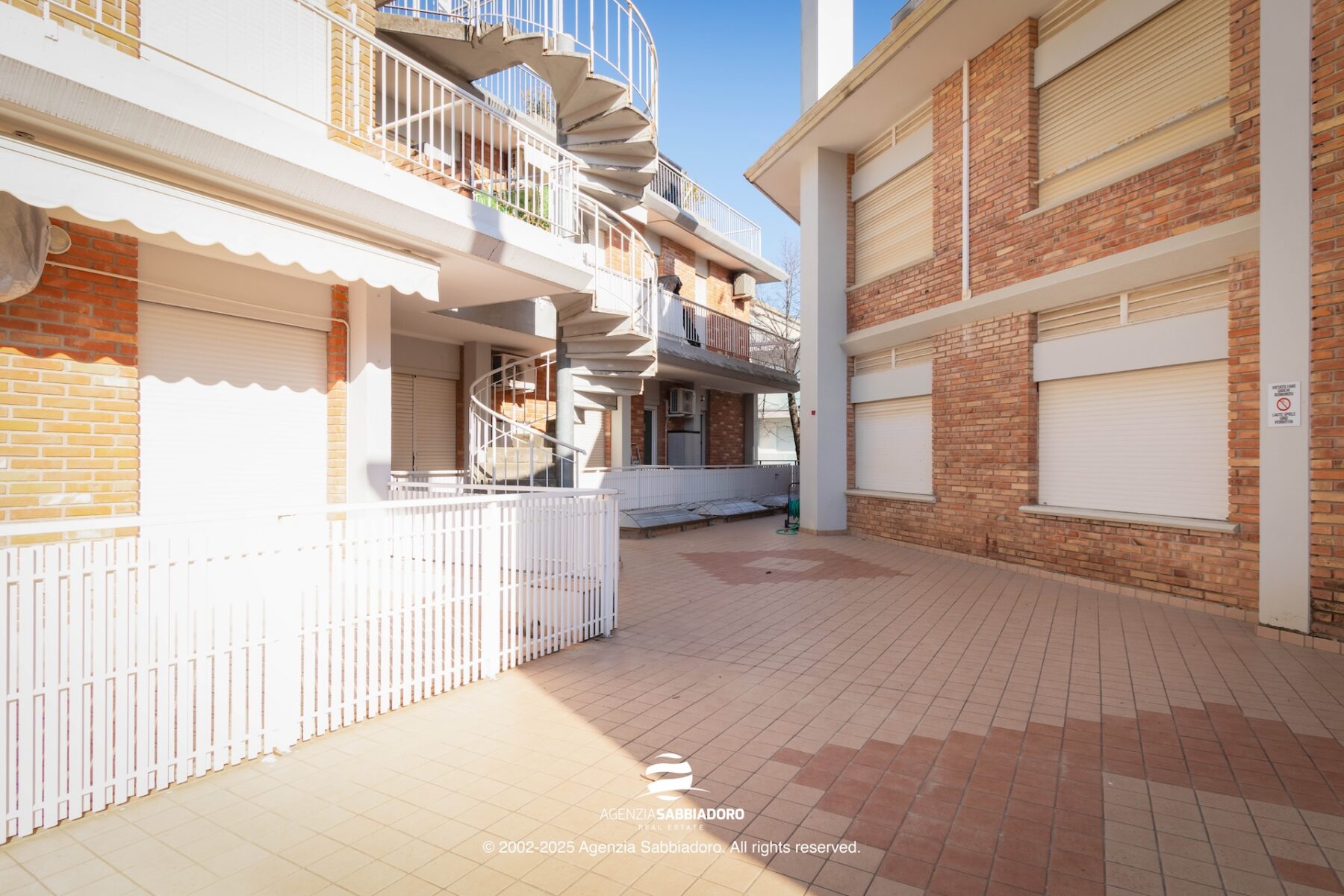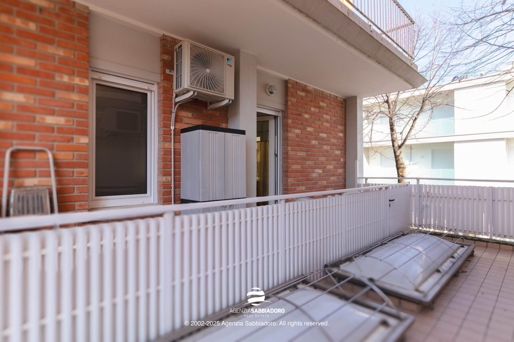 Ein besonders geschätztes Element ist die überdachte Terrasse, geeignet für Tisch und Stühle und ausgestattet mit einem praktischen Schrank für Reinigungs- oder Strandutensilien. Ein gut nutzbarer Außenbereich, der den Wohnkomfort der Wohnung ergänzt.