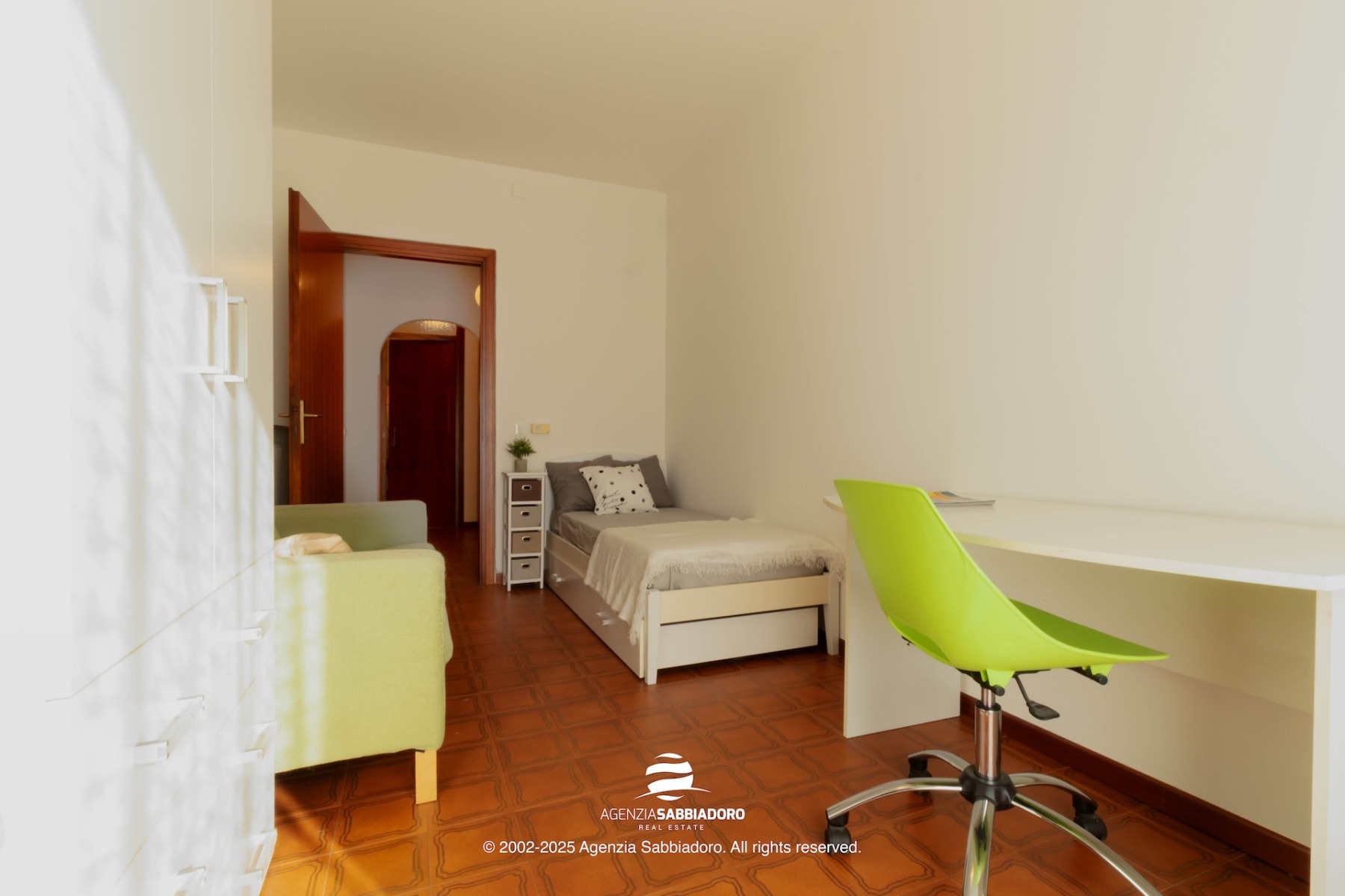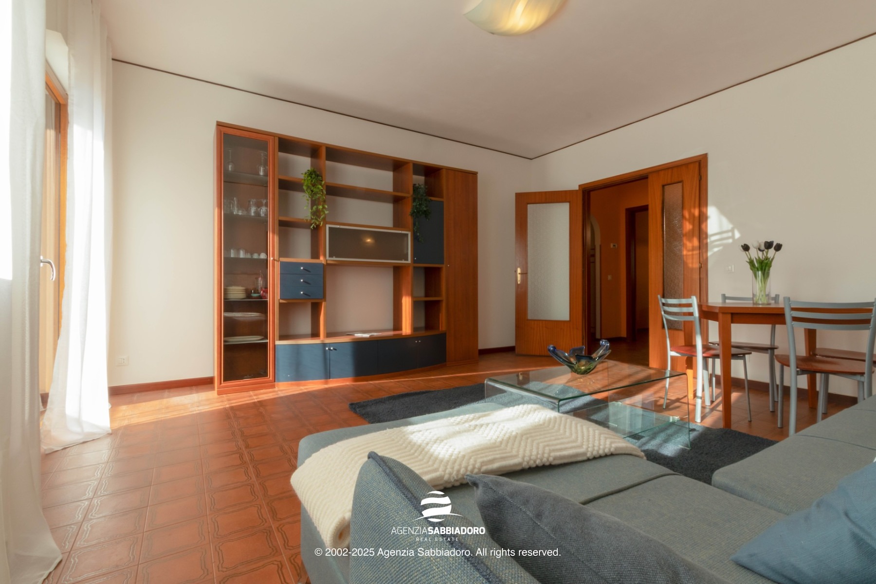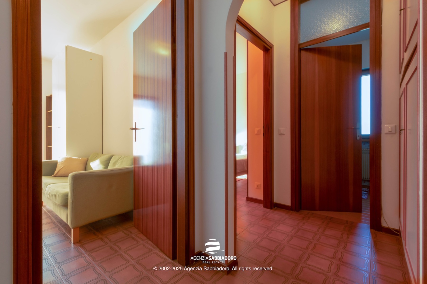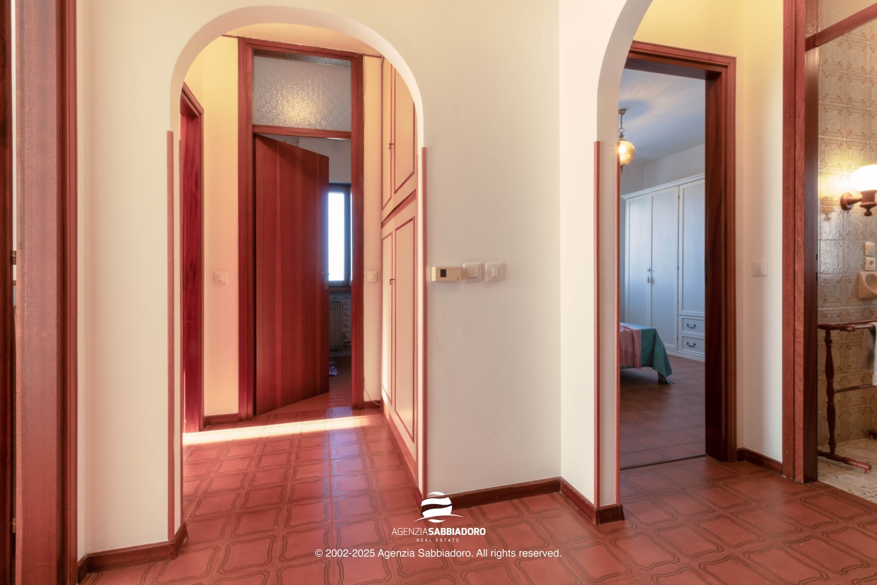Gli spazi interni sono generosi e versatili, con armadiature a muro ricavate nei disimpegni, ideali per contenere senza ingombrare.