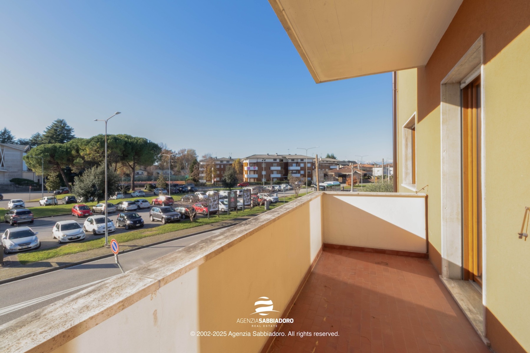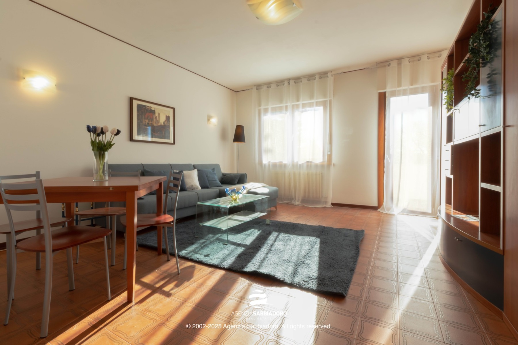 A sinistra si apre il soggiorno di circa 27 mq, ampio e ben proporzionato, con accesso diretto alla terrazza, esposta a sud e ideale per godere di luce naturale per gran parte della giornata.