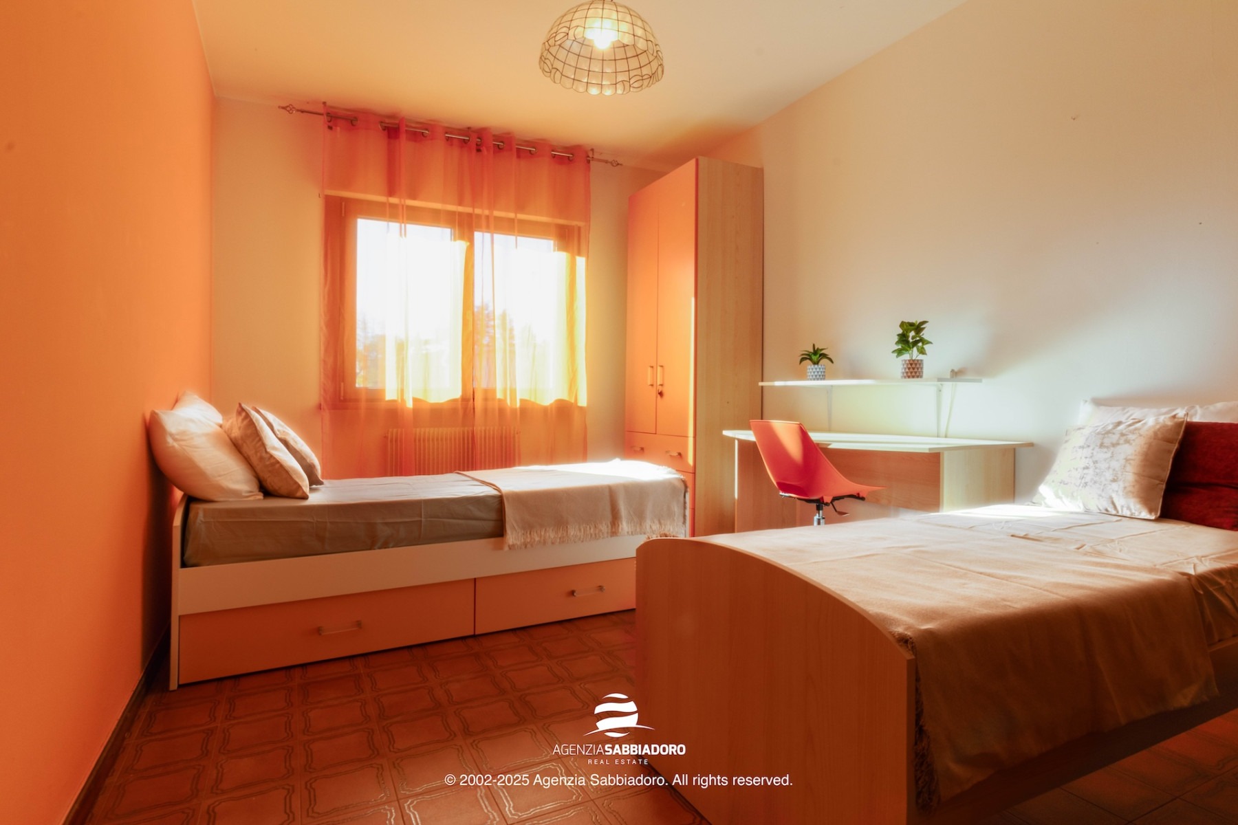 Sulla destra, un secondo disimpegno conduce alla camera matrimoniale (circa 15 mq) e al secondo bagno, anch’esso finestrato e dotato di box doccia.