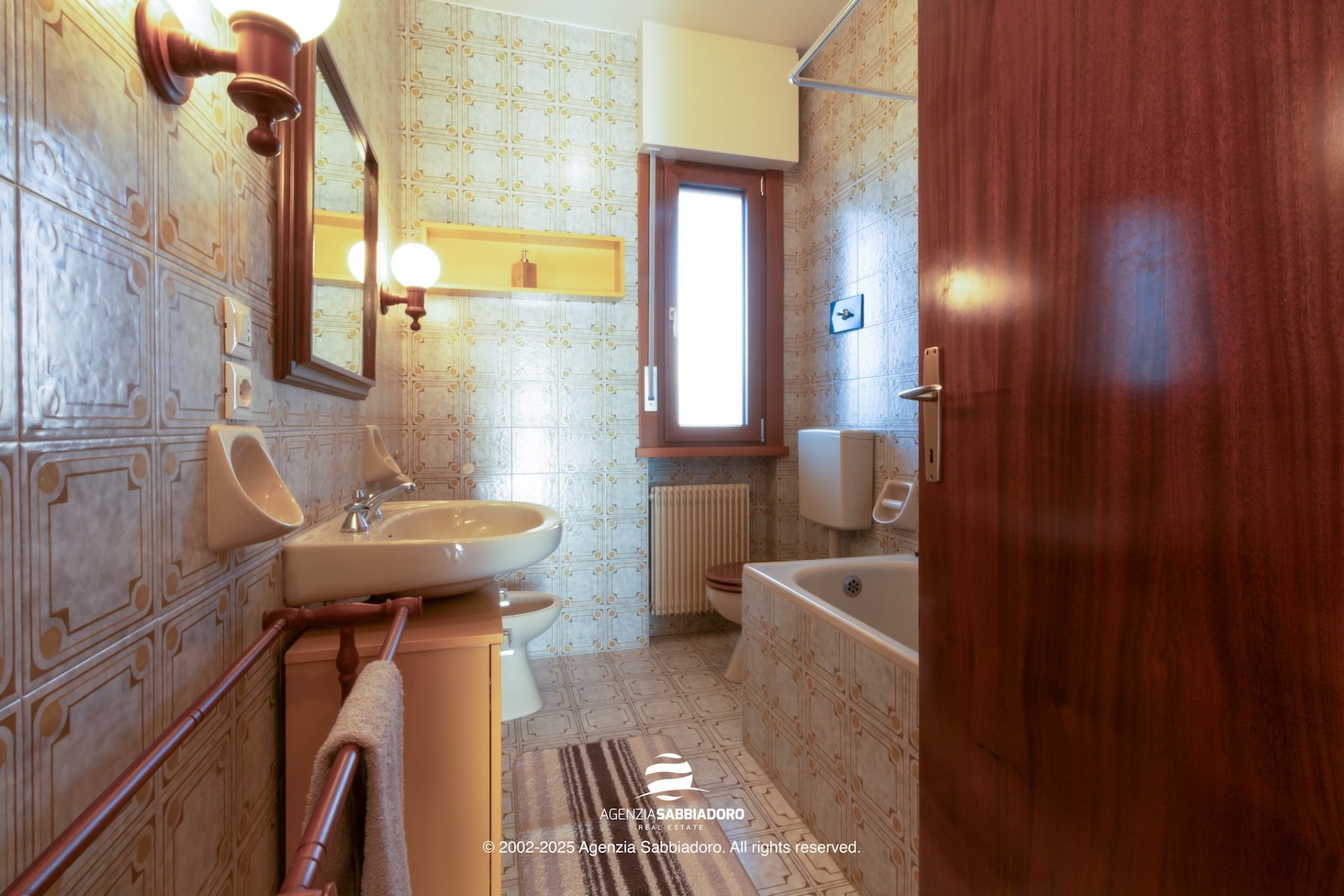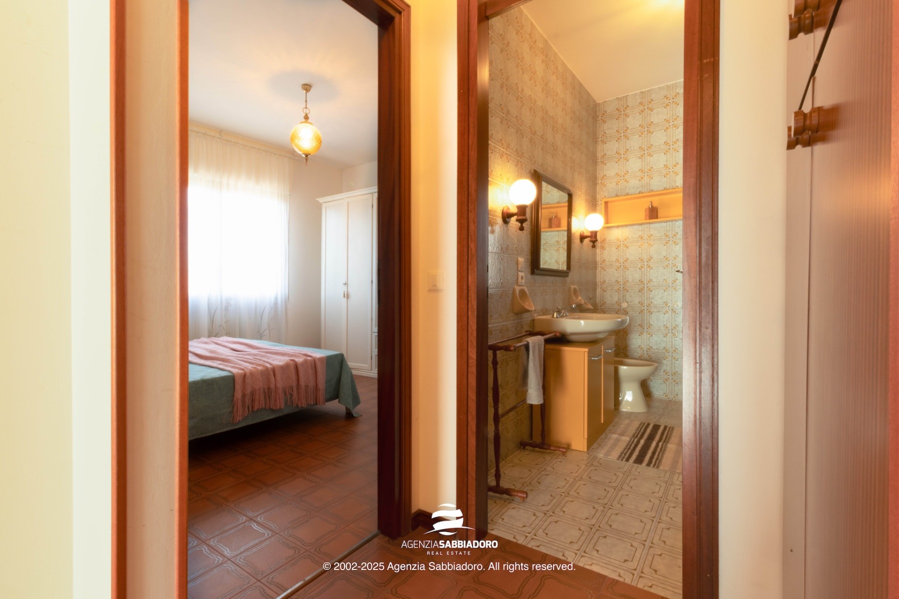 A sinistra si trovano due camere da letto (una doppia e una singola) e, in fondo al corridoio, il primo bagno finestrato con vasca.